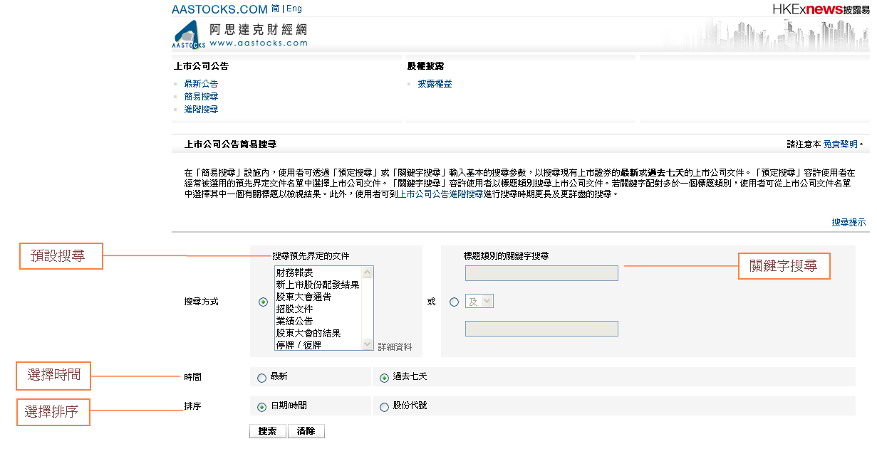 使用者可透過「簡易搜尋」內的預定搜尋或關鍵字搜尋輸入基本的搜尋參數,以搜尋在網站上登載的最新或過去七天之上市公司文件。