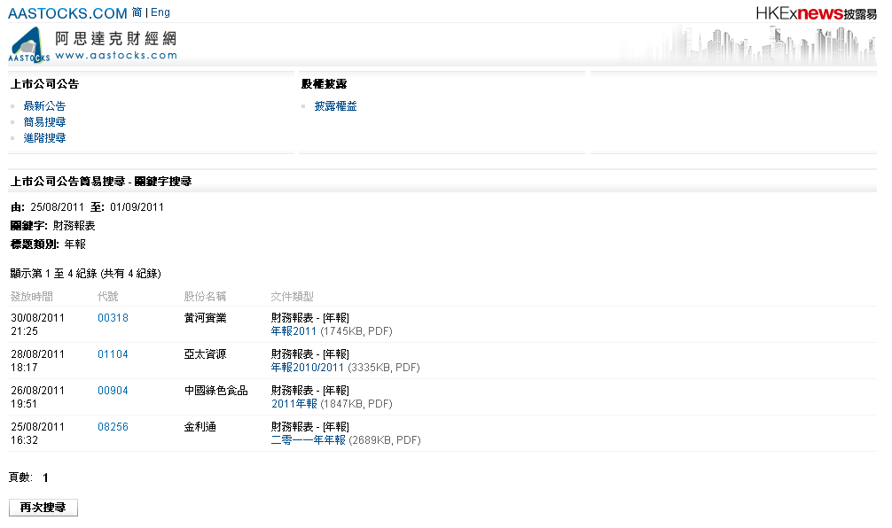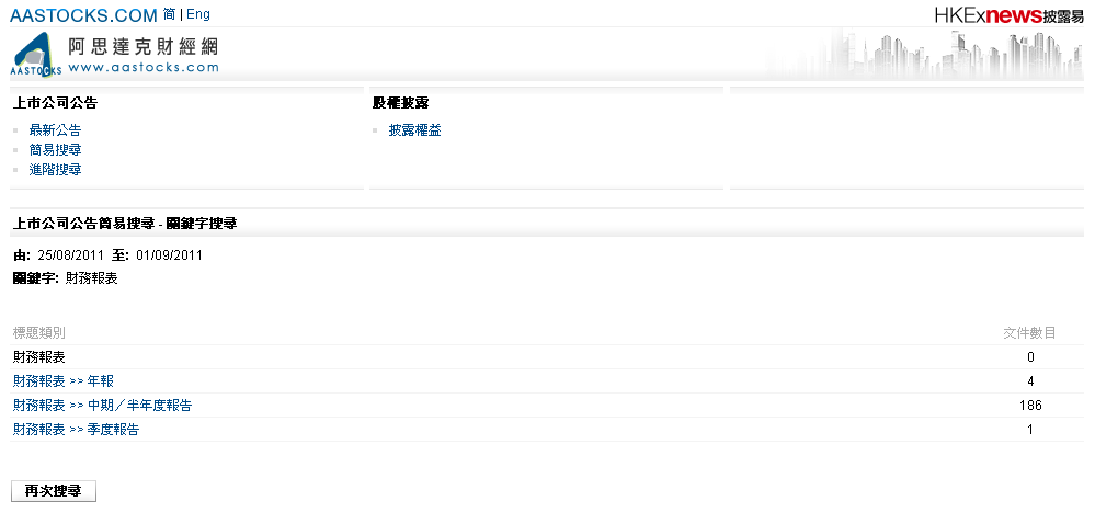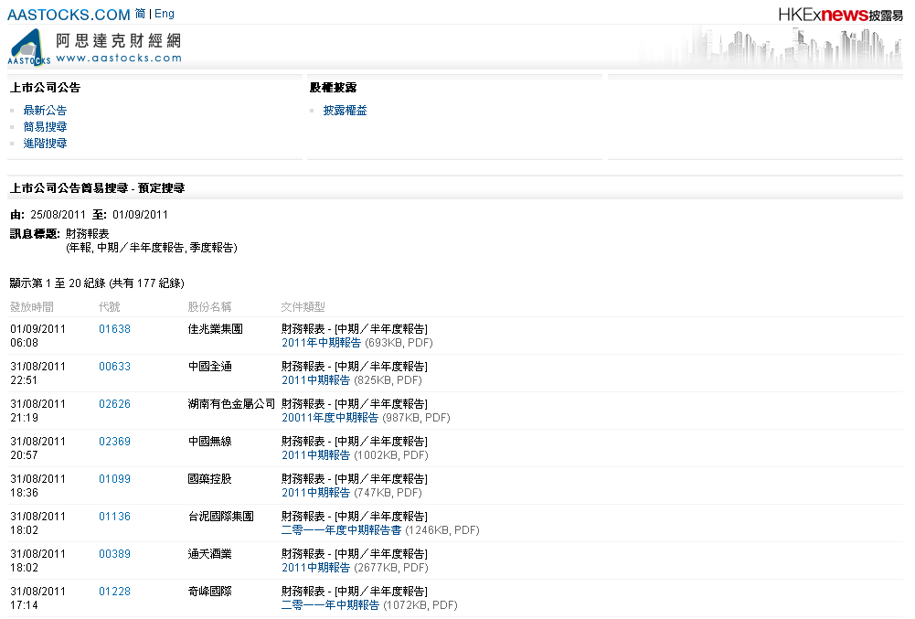 例如:若選擇「財務報表」及「過去七天」,將顯示過去七天發布的末期業績、中期業績及季度業績。